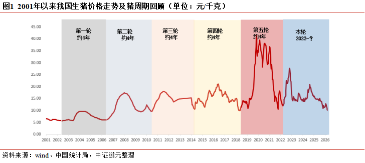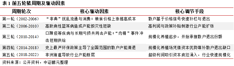 2001年以来我国已好意思满历经五轮猪周期,全体运行呈现“周期时长踏实(4-4.5年)、价钱波幅较大、峰谷特征权臣”的经典章程;尽管每轮驱动要素互异(如疾病、环保政策),但均顺服“激烈外生冲击→产能深度去化→价钱暴涨→产能膨胀→价钱下落”的经典轮回范式。