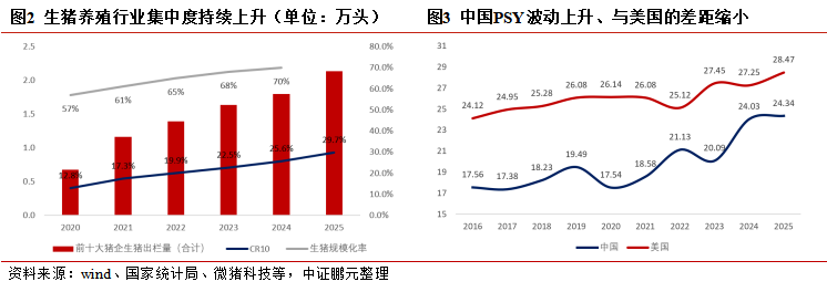 2018-2019年“非洲猪瘟”事件后,散户加快退出,行业完成从“散户主导”到“规模化、高效果”的转型:生猪衍生规模化率突破70%、CR10接近30%;同期,衍生时期升级、智能化普及、种猪改造推动生猪生产效用大幅莳植,2025年天下猪场平均PSY达24.34,较2016年莳植6.78头,中好意思PSY差距收窄至4.13头,头部企业完全成本捏续下探,主动去产能能源权臣弱化。