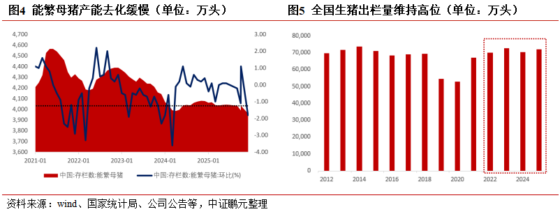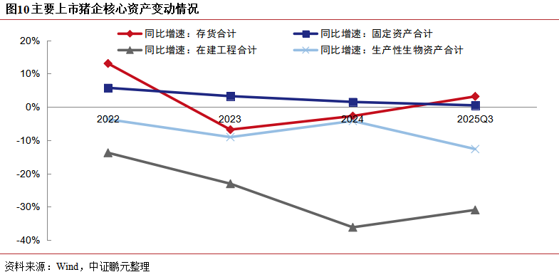 (1)增量参预近乎停滞:2025年生猪衍生企业继续降本增效、欺压规模的谋略策略,导致膨胀性钞票链接松开,削减增量参预,具体推崇为2025年1-9月在建工程账面价值同比暴减30.92%,生产性生物质产同比下滑12.76%,新建衍生阵势形成的固定钞票增速已降至0.34%,反应生产能膨胀主动放缓的趋势。