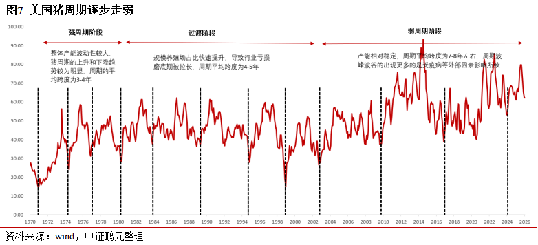 好意思国生猪产业的发展历程印证了规模化率先阈值后,经典强周期将向“后周期”(或弱周期)演进。自上世纪80年代大规模整合以来,其产业已呈现高度规模化、垂直一体化阵势,行业CR3约60%,最终呈现三大特征:1)价钱波动幅度权臣收窄:企业通过永久条约、期货用具处罚风险,不再因短期价钱波动大幅调节产量;2)周期章程弱化、磨底期拉长:生产决策基于永久老本预算,产能调节平缓,传统的3-4年周期律动被冲突;3)行业主导逻辑切换:产业集会度率先特定阈值后,传统由散户厚谊驱动的强周期,转向由寡头老本决策主导的弱周期。