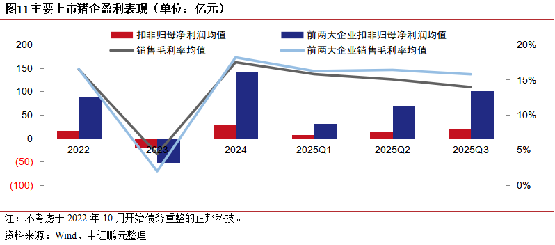 行业亏蚀面扩大:本轮周期以来,生猪价钱全体震憾下行,行业盈利空间被系统性压缩。样本企业中约半数在第六轮周期开启以来(2022-2024年)累积盈亏为负;2025年,衍生企业盈利及获现水平进一步弱化,尽管前三季度样本企业全体仍保捏盈利,但毛利率均值已降至13.94%,谋略性现款流入同比减少,且自9月起猪价已跌至盈亏均衡线隔邻,全行业濒临亏蚀风险,从样本企业预报的2025年功绩看:净利润均值较上年同期下滑约50%。