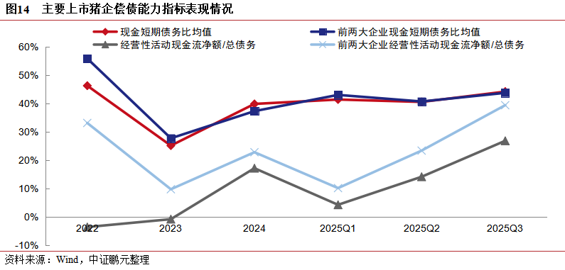 财务妥当性分化:头部企业凭借更强的成本欺压才智及更为积极的债务规模欺压力度,2025年以来主要偿债才智标的均值优于其他样本企业。前两大猪企钞票欠债率均值低于其他样本企业约9.7个百分点。关联词,部分头部企业因体量大,实足债务规模高,其债务结构问题仍存(如牧原股份短期债务占比高达69.80%)。