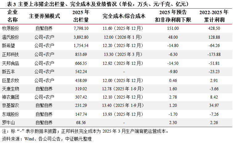 成本欺压分化与头部企业彰显韧性:领有极致成本欺压才智的企业展现出纷乱的周期抗压才智。在此布景下,“降本增效”已由谋略策略高涨为企业生计核心,头部企业凭借凸起的成本欺压才智与规模上风,盈利才智与其他企业差距权臣拉大。2025年1-9月,前两大猪企归母净利润同比增长率和毛利率水平均高于样本均值约2个百分点,牧原股份预报2025年扣非净利润下限为151亿元,同比降幅仅20%,展现出强周期抗压才智。完全成本手脚讨论衍生企业核心竞争力的关键标的,2025年末牧原股份已降至11.6元/千克,捏续保捏对其他企业1.50-2.00元/千克的率先上风,组成其龙头地位的核心护城河。