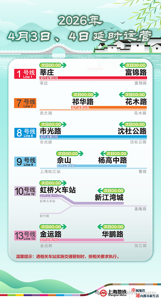4月3日和4月4日,上海地铁1、7、8、9、10、13号线六线延时运营。4月6日 ,1、2、10、17号线增开定点加班车至24时。为作念好节沐日返程技能要津站客流疏散使命,具体加开神情如下: