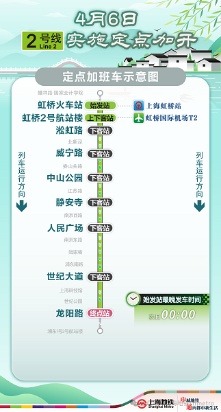 2号线在虹桥火车站常态定点加班车(23:30)的基础上加开2班定点加班车。加班车一起停泊虹桥火车站站、虹桥2号航站楼站、淞虹路站、威宁路站、中猴子园站、静安寺站、东谈主民广场站、世纪大路站、龙阳路站(终到站),其余车站按捺泊。停停车站中,虹桥火车站站(始发站),虹桥2号航站楼站可陡立客,其余车站只下不上,路过换乘站不能换乘。