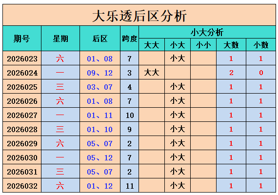 翔云优配最近10期后区大小比为11:9,最近10期后区大大组合开出1期,小大组合开出9期,小小组合开出0期。上期开出小大组合,本期看好小小组合出现。