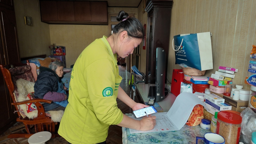 照顾员郭艳梅填写当日的长护险照护就业式样。