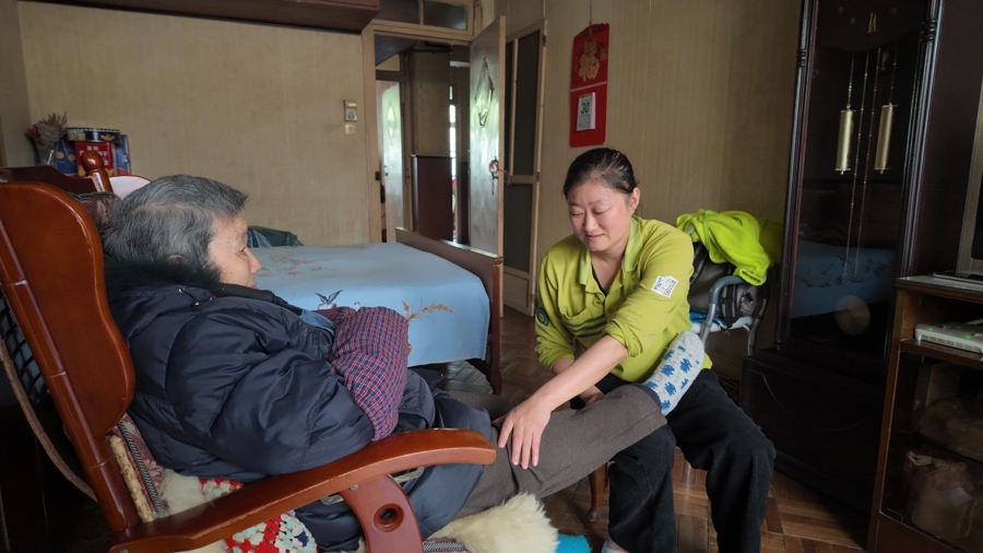 照顾员郭艳梅给周奶奶推拿。