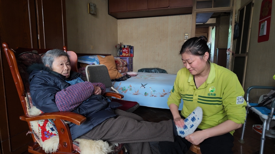 3月30日下昼2时30分许,太空飘起了荒芜的小雨。福寿康杨逸照顾站的照顾员郭艳梅骑着电动自行车来到了上海杨浦区的一户旧式住户楼,敲开了周金媛奶奶的家门。92岁的周奶奶正坐在客厅的老藤椅上看着电视,她耳朵不太好使,但听见这个熟悉的声息,眼睛亮了一下。