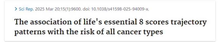 [2]Shi, Wenzai et al. “The association of life's essential 8 scores trajectory patterns with the risk of all cancer types.” Scientific reports vol. 15,1 9600. 20 Mar. 2025, doi:10.1038/s41598-025-94009-x