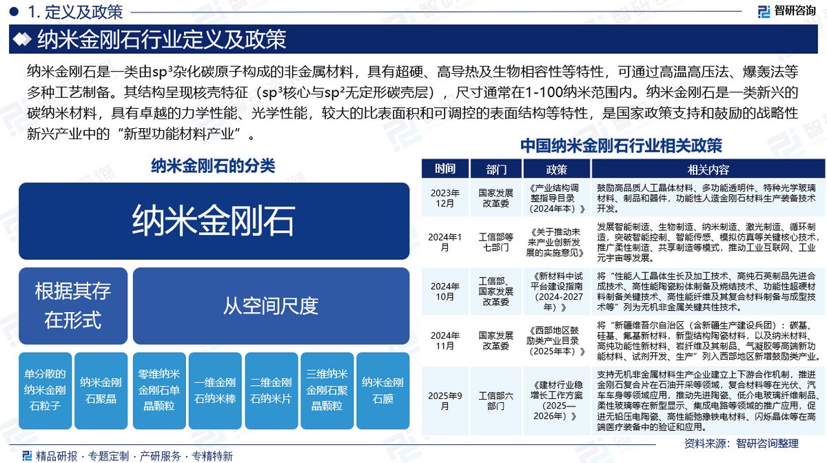 政策:纳米金刚石是一类新兴的碳纳米材料,具有超卓的力学性能、光学性能,较大的比名义积和可调控的名义结构等特质,是国度政策救济和饱读舞的战术性新兴产业中的“新式功能材料产业”。2024年11月,国度发展改进委印发《西部地区饱读舞类产业目次(2025年本)》,将“新疆维吾尔自治区(含新疆坐褥耕作兵团):碳基、硅基、氟基新材料,新式结构陶瓷材料,以及纳米材料、高纯功能性新材料、岩纤维过头成品、气凝胶等高端新功能材料、试剂开发、坐褥”列入西部地区新增饱读舞类产业。2025年9月,工信部六部门印发《建材行业稳增长职责决策(2025—2026年)》,救济无机非金属材料坐褥企业竖立高下流合营机制,推动金刚石复合片在石油开采等领域,复合材料等在光伏、汽车车身等领域行使,推动先进陶瓷、低介电玻璃纤维成品、柔性玻璃等在新式线路、集成电路等领域的实行行使,促进无铅压电陶瓷、高性能弛豫铁电材料、精通晶体等在高端医疗装备中的考据和行使。
