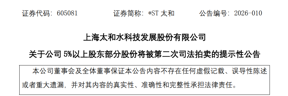 据悉,上海市静安区东说念主民法院于 2026 年 2 月 28 日 10 时至2026 年3 月1 日10时止,对*ST太和5%以上鼓吹何文辉合手有的公司无穷售通顺股 5,169,094 股进行公开的收集王法拍卖。但这次拍卖的主意因在设施本事内无东说念主出价已流拍。